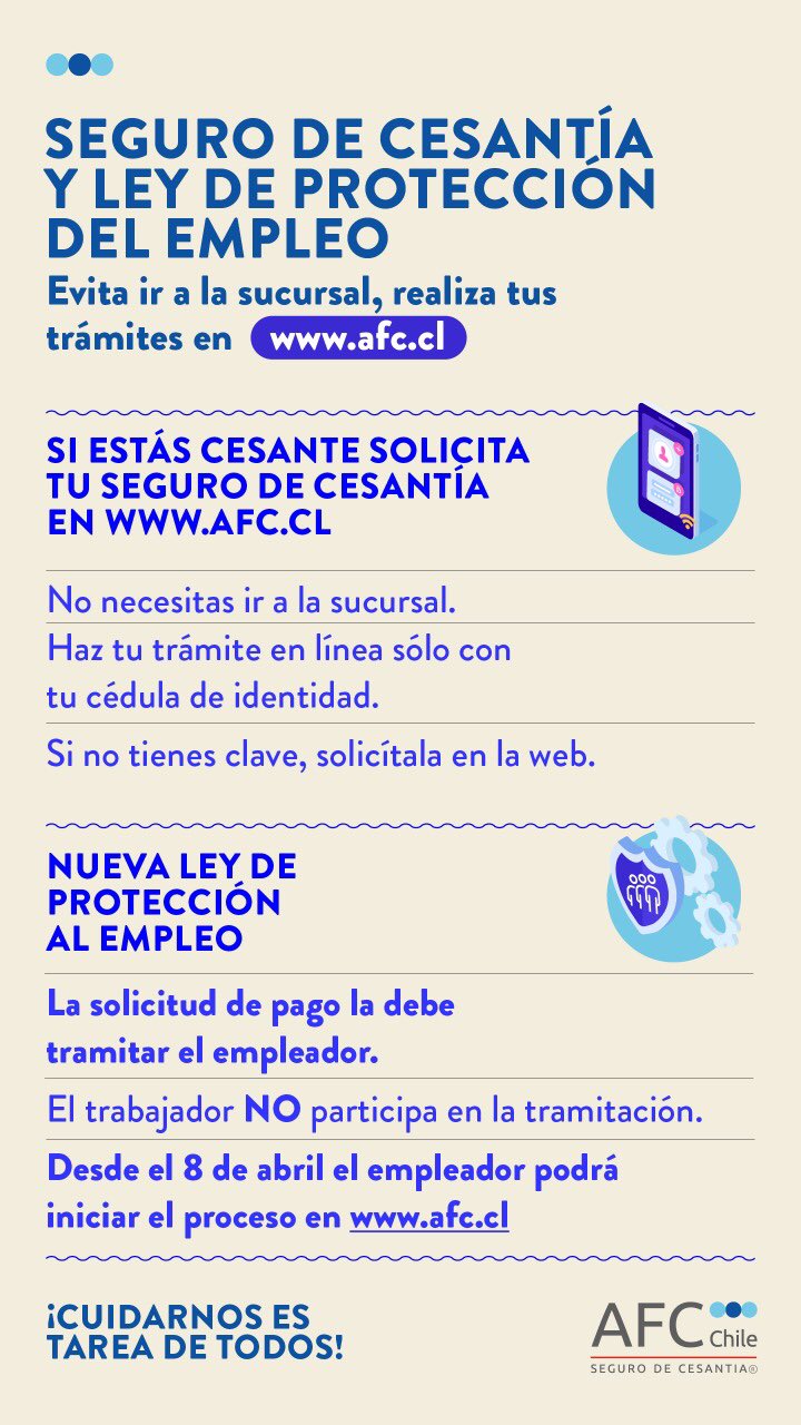 En afc.cl, efectué el retiro de los fondos que eran app 60.000 pesos, luego de unos días ingrese el cobro de del seguro de cesantía (no me dejo ingresarlo al mismo tiempo), no existía ninguna clausula por el cobro de ambos, pero en la sucursal de viña del mar , me informaron que como había echo el. Afc activará pago de dos giros adicionales del seguro de cesantía: El seguro de cesantía contará con dos pagos más. De todas formas, las oficinas de la afc seguirán atendiendo, de lunes a jueves entre las 9:00 y 14:00, y el viernes de 8:30 a 13:30, excepto las sucursales ubicadas en miraflores, teatinos y providencia, que permanecerán cerradas desde este. El seguro de cesantía es un instrumento de protección social, cuyo objetivo es apoyar económicamente en caso junio 2015. Todo lo que hay que saber para cobrarlo. Con esto, se busca reforzar el distanciamiento físico , al minimizar los tiempos de espera, ya que las. En caso de cesantía, si usted está afiliado al seguro, podrá recibir beneficios monetarios, sociales y de mediación laboral, orientados a mitigar su falta de ingresos y facilitar su reinserción al mundo del trabajo. Te responden todas las dudas, con paciencia y rapidez. Coronavirus seguro de cesantía 26.03.2020 / 07:37. El empleador debe realizar la solicitud online en www.afc.cl, en la sección que estará disponible desde el 15 de abril. Administradora de fondos de cesantía de chile. Durante esta jornada, la administradora de fondos de cesantía (afc) anunció el seguro de cesantía contará con dos nuevos pagos.